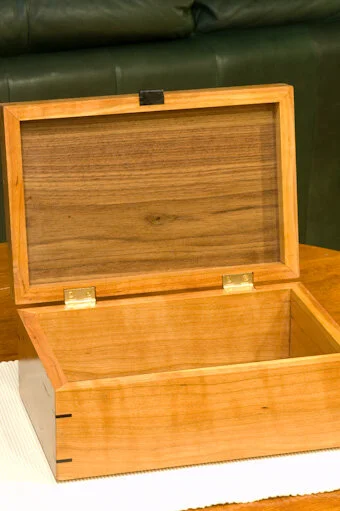 Cherry boxes with floating walnut top, mitered corners with ebony keys, and an ebony pull